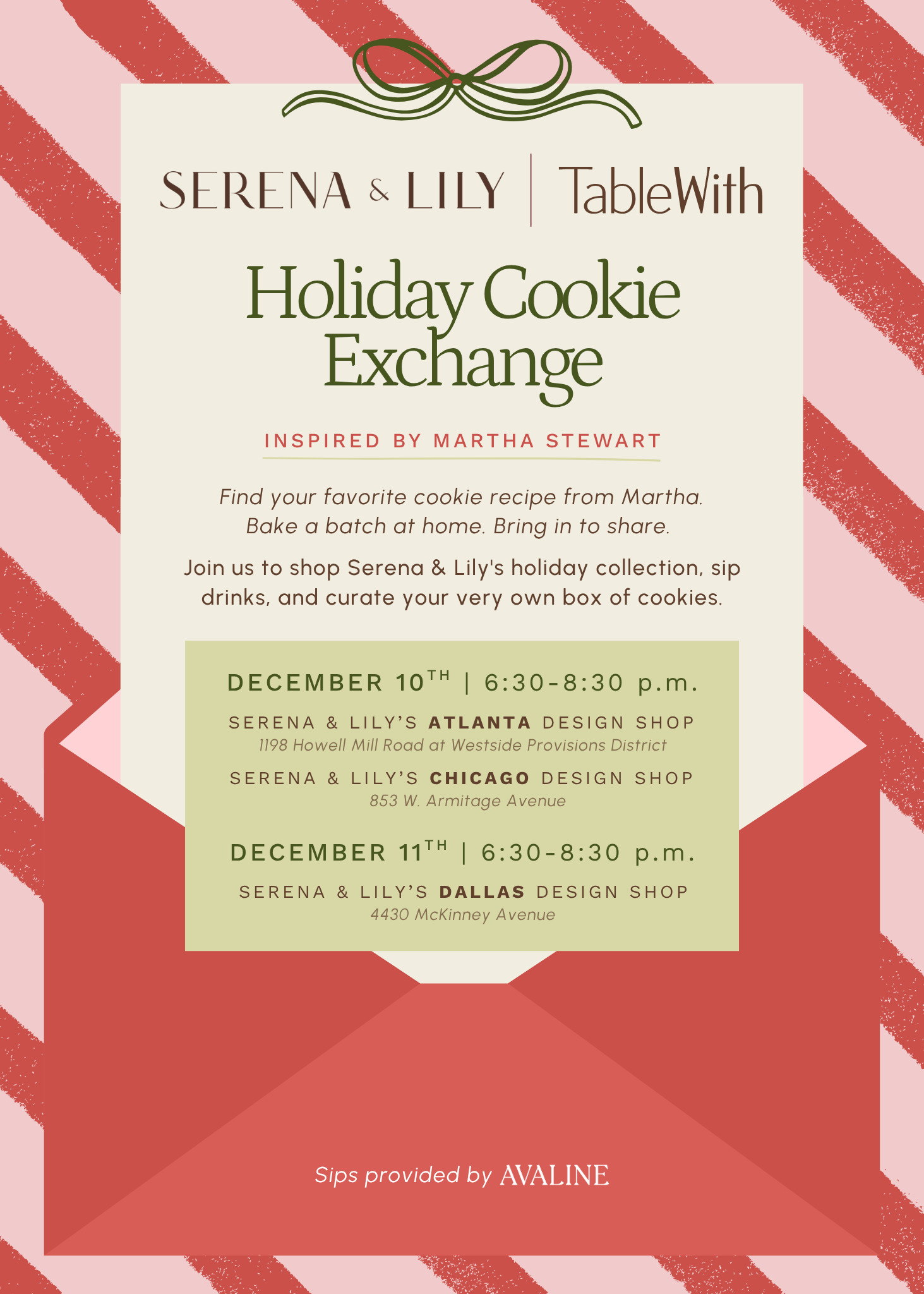 Join us for a festive evening celebrating the joy of holiday baking and our December TableWith partner, Martha Stewart, on the re-release of her iconic book, Entertaining. Explore Serena & Lily’s holiday collection, take in a seasonal tablescape, enjoy a drink and curate your own cookie box to take home - the ultimate Martha-inspired holiday celebration.